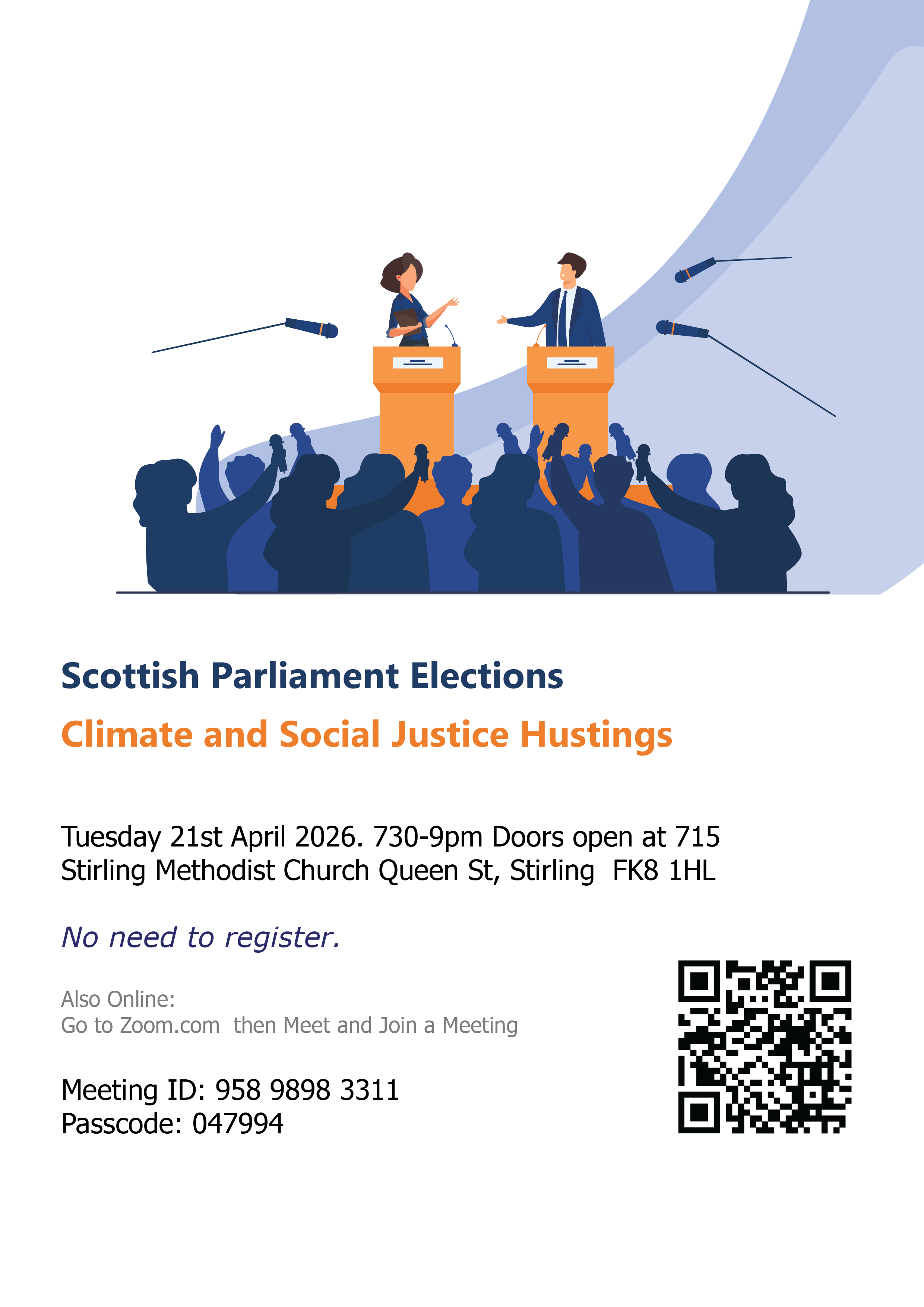 Prior to the Scottish Parliamentary Elections, a special Climate and Social Justice Hustings will be held on Tuesday 21st April, 7.30 – 9pm at Stirling Methodist Church and online. For details see here
