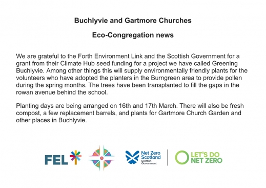 The parish churches in Buchlyvie and Gartmore have registered as Eco-Congregations, recognising that, for Christians, caring for the Earth is a proper response to a loving creating God. Eco-Congregation Scotland provides a variety of helpful resources and ideas. Just before Lockdown we had put out a survey, enquiring about measures to reduce home energy use, to start to gauge interest and build a bank of people who would share their experiences, good or bad, with others considering similar measures. To offer your experience or consult others, please make contact by using the church email address.